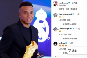 nba直播11月1日讯 由于上赛季的出色表现,皇马射手姆巴佩夺得职业生涯首个欧洲金靴奖。在社交媒体上,法国人发表了自己的感受,而队友贝林厄姆则和他进行了互动。