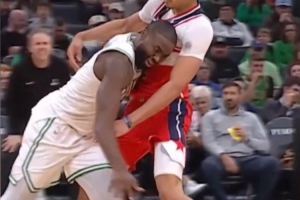 nba直播11月6日讯 今天凯尔特人战胜鹈鹕的比赛中,杰伦·布朗发际线粉又粘到对手白T上了。