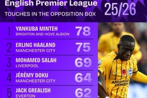 nba直播11月11日讯 英超联赛已经进行了11轮,squakwa也统计了本赛季英超在对方禁区内触球次数情况,明特力压哈兰德居首。