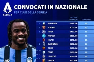nba直播11月12日讯 德国转会市场统计了意甲各队被国家队征召球员的数量,并列出榜单,亚特兰大13人居首,都灵12人次席。