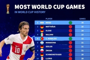 nba直播11月15日讯 克罗地亚获得世界杯参赛资格,莫德里奇将迎来第5届世界杯,德国转会市场统计了球员在世界杯的出场次数,并列出榜单,梅西26场居首,C罗22场、莫德里奇19场。