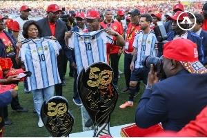 阿根廷与安哥拉比赛前,梅西将球衣赠予安哥拉总统,总统回赠他一座纪念安哥拉独立50周年的特别奖杯。