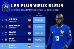 nba直播11月15日讯 世预赛欧洲区比赛,坎特踢满全场,帮助法国主场4-0击败乌克兰,德转列出了德尚执教法国队以来年龄最大出场球员排名,吉鲁居首,坎特排在第5位。