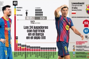nba直播11月16日讯 在巴萨客场4比2击败塞尔塔的比赛中,莱万上演了帽子戏法,这也是他在巴塞罗那时期的第四次。凭借这三个进球,这位波兰前锋跻身巴萨21世纪帽子戏法次数最多的球员的精英榜单之中。
