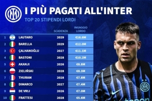 nba直播11月18日讯 德国转会市场统计了国米球员的税前年薪,并列出榜单,劳塔罗1660万欧居首,巴雷拉、恰尔汗奥卢二三位。