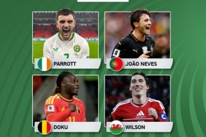 nba直播11月19日讯 欧洲世预赛最后一轮比赛战罢,欧足联官方公布了本轮最佳球员候选名单。