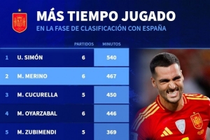 nba直播11月19日讯 德国转会市场统计了西班牙球员本届世预赛的出场时间,并列出榜单,门将西蒙540分钟居首,梅里诺467分钟非门将球员中最多。