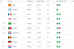 nba直播11月19日讯 FIFA官方公布了新一期国家队世界排名,西班牙、阿根廷、法国仍位居前三,巴西上升2位至第5,德国升至第9,意大利下降3位,跌至第12。