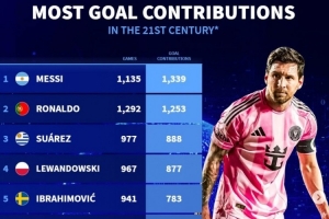 nba直播11月24日讯 《转会市场》统计了新世纪各项赛事直接参与进球情况,梅西力压C罗居首。