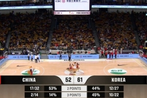 nba直播11月28日讯 男篮世亚预阶段一,中国男篮三节52-61落后韩国男篮。