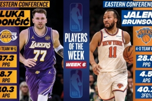 nba直播12月2日讯 今日NBA官方宣布,湖人球星东契奇与尼克斯球星布伦森分别当选NBA上周西部和东部周最佳球员。