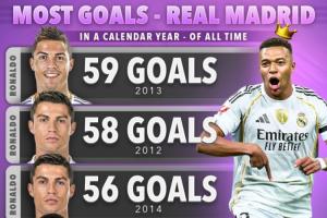 nba直播12月05日讯 西甲第19轮,皇马3-0客胜毕尔巴鄂竞技,姆巴佩2射1传,今年俱乐部赛事打进55球。据Score90统计,他在皇马历史自然年进球榜上已经升到了第4位,姆巴佩今年还剩4场比赛,有希望冲击C罗的59球纪录。