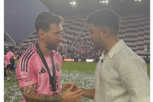 梅西斩获职业生第47座奖杯,阿根廷国家队跟队记者Gastón Edul社媒晒出与梅西的合照,配文:“足球史上荣誉最多的球员,采访内容即将发布。”