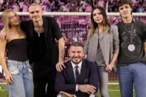 小贝妻子维多利亚与子女罗密欧、克鲁兹和哈珀均到场助阵,唯独长子布鲁克林缺席。