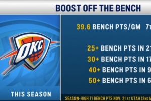本赛季的雷霆有13场比赛至少2名替补球员得分10+,3场比赛至少3名替补得分10+。