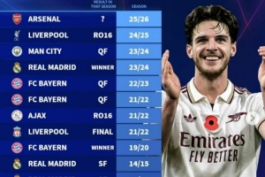 nba直播12月11日讯 本赛季阿森纳在欧冠6战全胜,德转也盘点了欧冠历史前6场全胜球队最终成绩,其中皇马、拜仁曾拿到冠军,具体如下:
