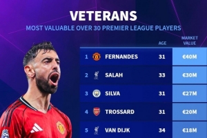 nba直播12月13日讯 德国转会市场列出了英超年龄30+球员身价排名,B费居首,萨拉赫次席。