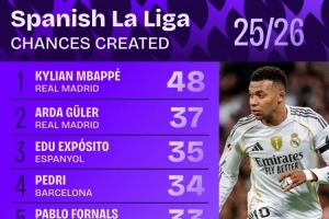 nba直播12月16日讯 Squawka统计了球员本赛季在西甲创造机会的次数,并列出榜单,姆巴佩48次居首,居莱尔37次第二。