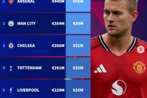 nba直播12月16日讯 德转盘点了英超Big6球队防线平均身价榜(不包括门将),其中阿森纳高居榜首,具体如下(防线总身价+平均身价):