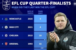 nba直播12月16日讯 英格兰联赛杯八强战即将开战,《转会市场》也统计了八强球队上次在联赛杯夺冠距今的时间。