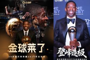 nba直播12月17日讯 登贝莱荣膺2025FIFA年度最佳球员,包揽2025金球奖和2025FIFA最佳两项大奖。