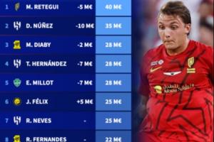 2、努涅斯(利雅得新月)3500万欧(-1000万)