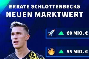 nba直播12月18日讯 德国转会市场预热多特中卫施洛特贝克最新身价,最高可能达到6000万欧,最低4500万欧元。