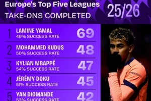 nba直播12月18日讯 数据机构squawka统计了本赛季五大联赛成功过人情况,巴萨边锋亚马尔独自领跑。