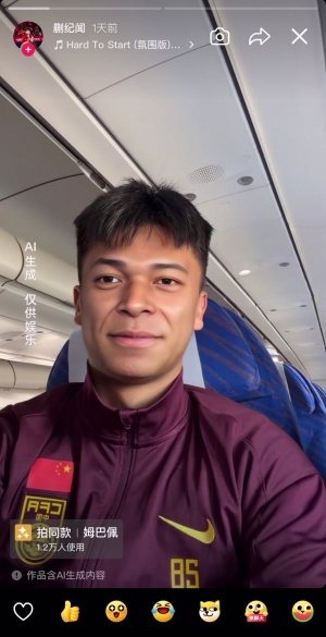 蒯纪闻在社媒上分享了使用AI姆巴佩特效下的自己和王钰栋。蒯纪闻拍着自己然后将镜头转向王钰栋,王钰栋看到后愣了一下然后笑了出来。