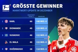 nba直播12月19日讯 德国转会市场列出了德甲球员身价上涨排名,卡尔上涨4000万欧居首。