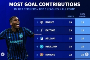 nba直播12月20日讯 《转会市场》统计了本赛季五大联赛U23前锋各项赛事参与进球情况,博尼、埃基蒂克各参与11球最多。