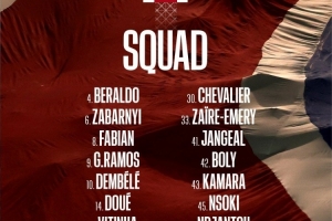 前锋: 9-贡萨洛·拉莫斯、10-登贝莱、14-杜埃、47-恩贾恩图