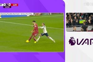 nba直播12月21日讯 英超第17轮,热刺对阵利物浦。哈维·西蒙斯第29分钟蹬踏范戴克,被直红罚下。