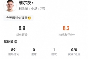 nba直播12月21日讯 利物浦在本轮英超焦点战对阵热刺,维尔茨本场数据如下: