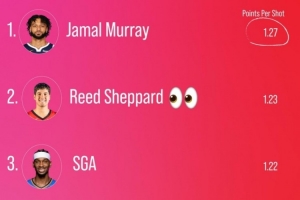 nba直播12月22日讯 数据专家Kirk Goldsberry晒出了本赛季至今平均每次跳投得分最多的球员榜单,具体如下: