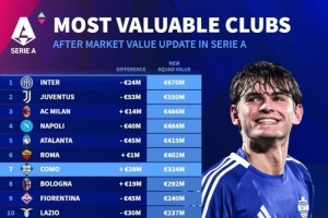 nba直播12月24日讯 德国转会市场列出了意甲球队身价排名,国米、尤文、米兰前三。