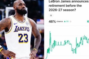 nba直播12月24日讯 据美媒Kalshi Sports预测,最新消息显示,勒布朗·詹姆斯有46%的可能性在下个赛季开始前宣布退役。他是否会不进行告别巡演就直接退役呢?