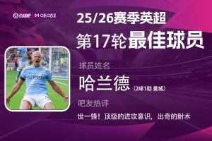 2025-2026赛季英超火热进行中,nba直播和咪咕体育联合发起每轮英超最佳球员评选活动!第17轮评选结果已经出炉,曼城前锋哈兰德(42984票)力压罗杰斯(34236票),连续两轮当选!