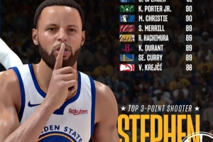 nba直播12月24日讯 今日NBA 2K官方晒出了最新联盟三分能力值前十球员,具体如下: