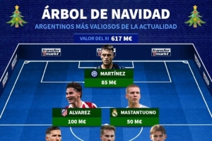 nba直播12月25日讯 圣诞节之际,德国转会市场排出了阿根廷身价最高圣诞树阵容,劳塔罗、阿尔瓦雷斯、恩佐、麦卡利斯特在列。