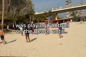 nba直播12月25日讯 亚马尔圣诞节期间现身迪拜海滩,与小球迷一起踢球。