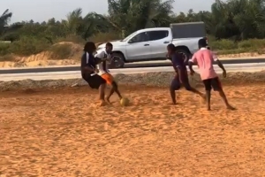 nba直播12月26日讯 巴萨边卫孔德在非洲贝宁度假,与孩子们一起踢球。