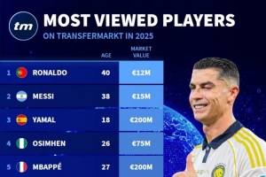 nba直播12月26日讯 德国转会市场统计了2025年球员信息页面的浏览量,并列出排名,C罗、梅西、亚马尔前三。