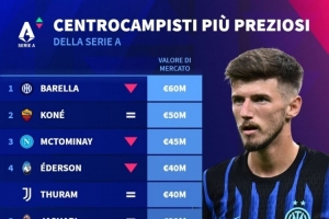 nba直播12月27日讯 德国转会市场统计了意甲中场中路球员的身价,并列出榜单,巴雷拉6000万欧居首。