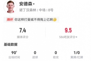 nba直播12月27日讯 诺丁汉森林在本轮英超1-2不敌曼城,埃利奥特·安德森本场数据如下: