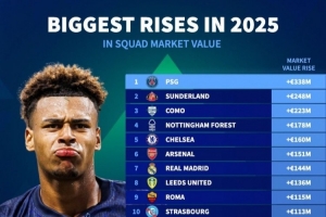 nba直播12月28日讯 德转已经更新了各大联赛球员身价,并据此统计了在2025年的俱乐部身价涨幅情况,新科欧冠冠军巴黎领跑。