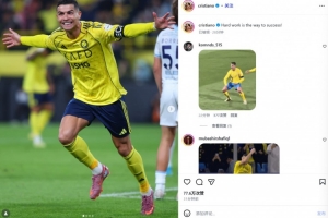 C罗也在赛后通过社媒晒出自己的庆祝照,并配文:“努力工作正是成功之道!”