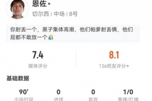 nba直播12月28日讯 切尔西在本轮英超1-2被维拉逆转,恩佐本场数据如下: