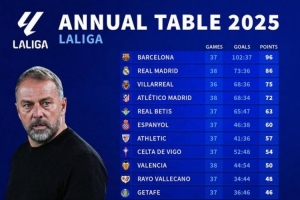 nba直播12月28日讯 2025年即将过去,《转会市场》也统计了2025年西甲总积分榜情况,巴萨独自居首。