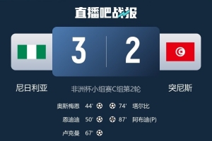 nba直播12月28日讯 非洲杯小组赛第二轮比赛,尼日利亚3-2击败突尼斯,晋级淘汰赛。